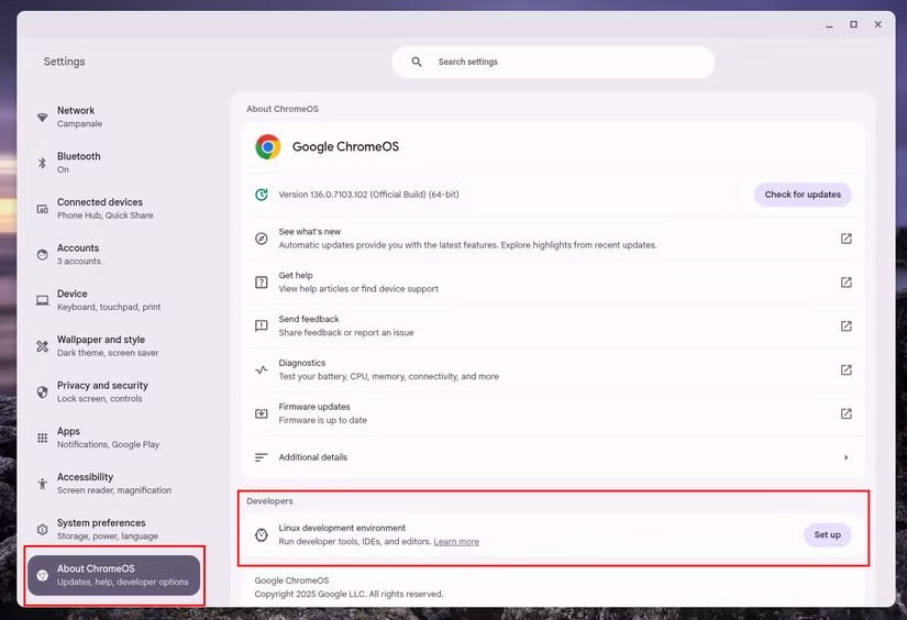 - Navigate to "About Chrome OS" and scroll down to the Developers Section