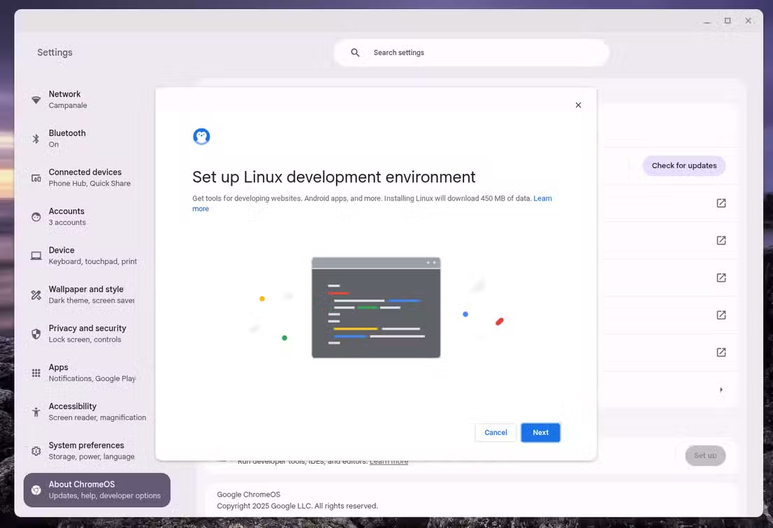 A popup should appear prompting you to set up Linux on your Chromebook. Click "Install"